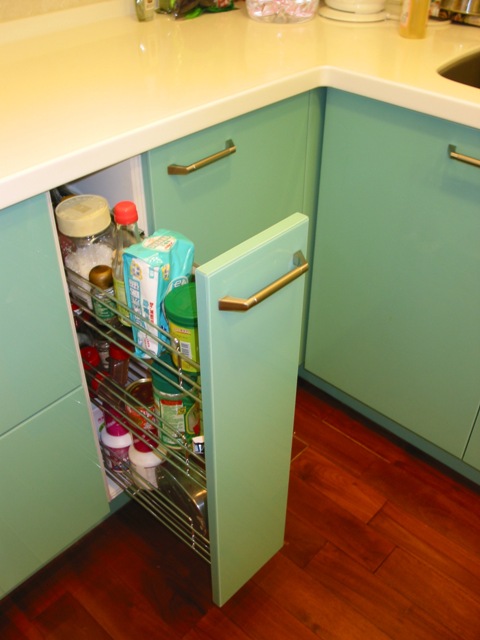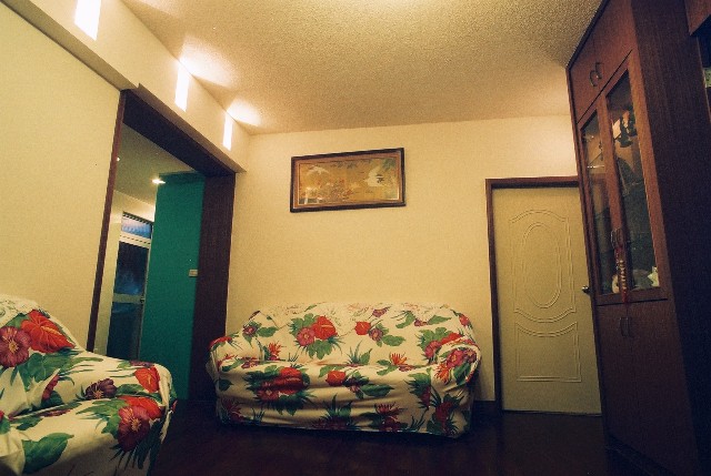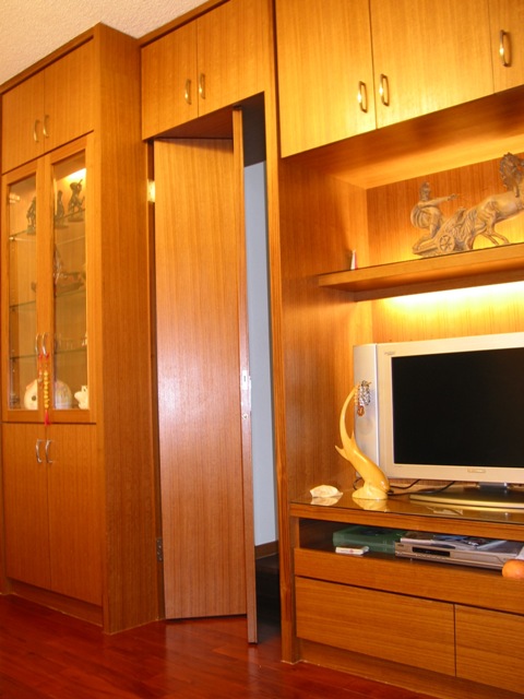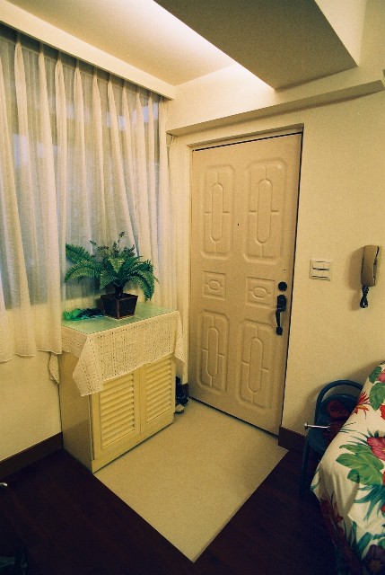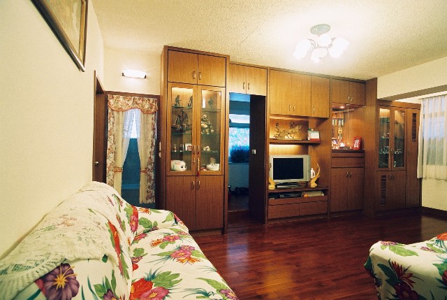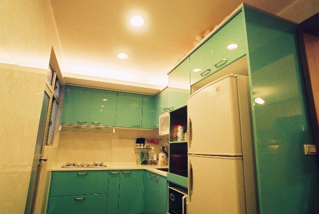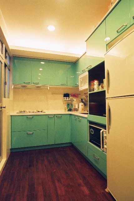 實木電視櫃與木地板,空間色系整體一致,造型簡單俐落,避免木質感過於沉重,建議屋主天花板不另做造形設計,以天然採光維持空間感。女主人常用的廚房及後陽台,特別挑選喜愛的秋香綠色,配以明亮磁磚,實用性高且整齊好清潔。