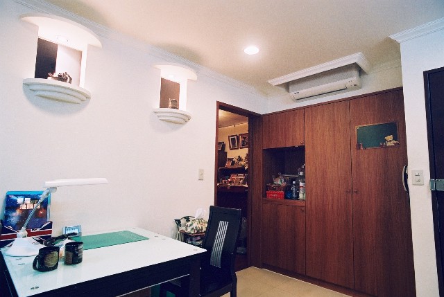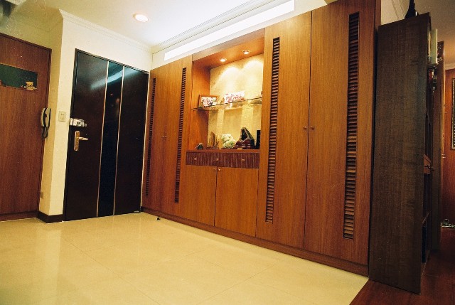| 以動線安排與空間規劃補足坪數不大的限制,配合時常有訪客來訪的需求,客廳與餐廳採開放式,以流暢的動線巧妙連結,營造出明亮的超坪數空間。海島型柚木地板鋪陳搭配古董窗花,客廳古典大方。以輕隔間規劃佛堂與兒童房,搭以美耐板材質訂製雙面櫥櫃,大幅節省預算並提供有效的空間使用。廚身量身訂製,有效收納常用小家電,以黃藍等色彩搭配,具機能性又不失活潑氣氛。 |