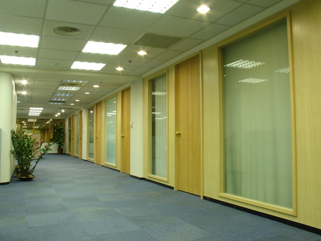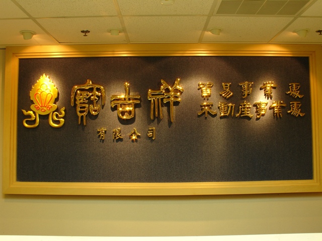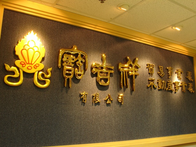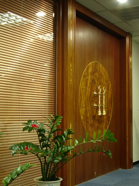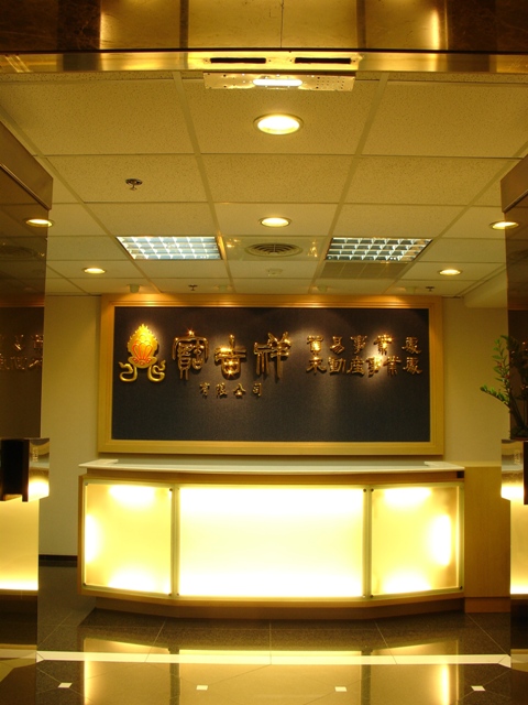 大門櫃檯以大理石地板與檯面搭配,簡潔大方。總裁辦公室以胡桃木實木條、金邊壓條,搭配木紋裝飾,貴氣穩重。整體以木作山毛櫸、噴沙玻璃營造整體簡潔線條。