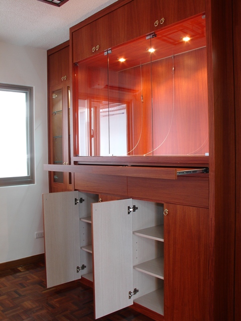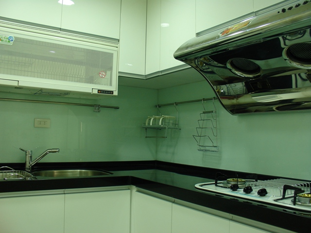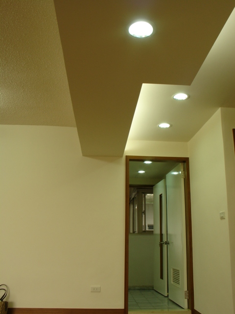全室三面更新氣密窗,加強隔音效果。餐廳上方新建天花版與照明避開大樑與減少壓迫感。廚房更新整套廚具,特別挑選白色一系列廚具,增加明亮度與空間感。另將較少利用的客房改為佛堂,純手工的佛龕貼以實木梨花木皮,更顯莊嚴;主臥室衛浴重新改造,貼以橫式拋光石英磚,將原狹小的浴室視覺上顯的更寬廣。