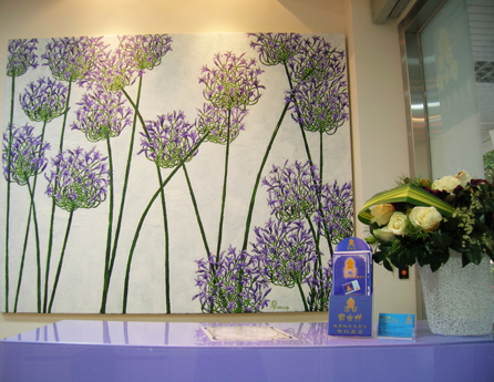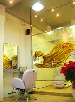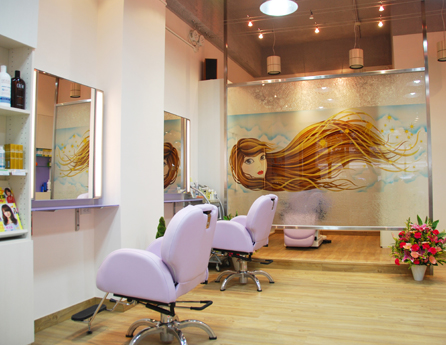 整體運用淡雅的白色及粉紫色等明亮色調為主,以水泥噴漆之自然手法處理開放的天花,並規劃線性照明,讓小坪數空間能塑造出寬敞感,又以夢幻般之插圖製成造型藝術玻璃牆,並搭配設計款椅,讓空間營造出愉悅、清新、舒適且專為女性提供夢想之美髮沙龍。