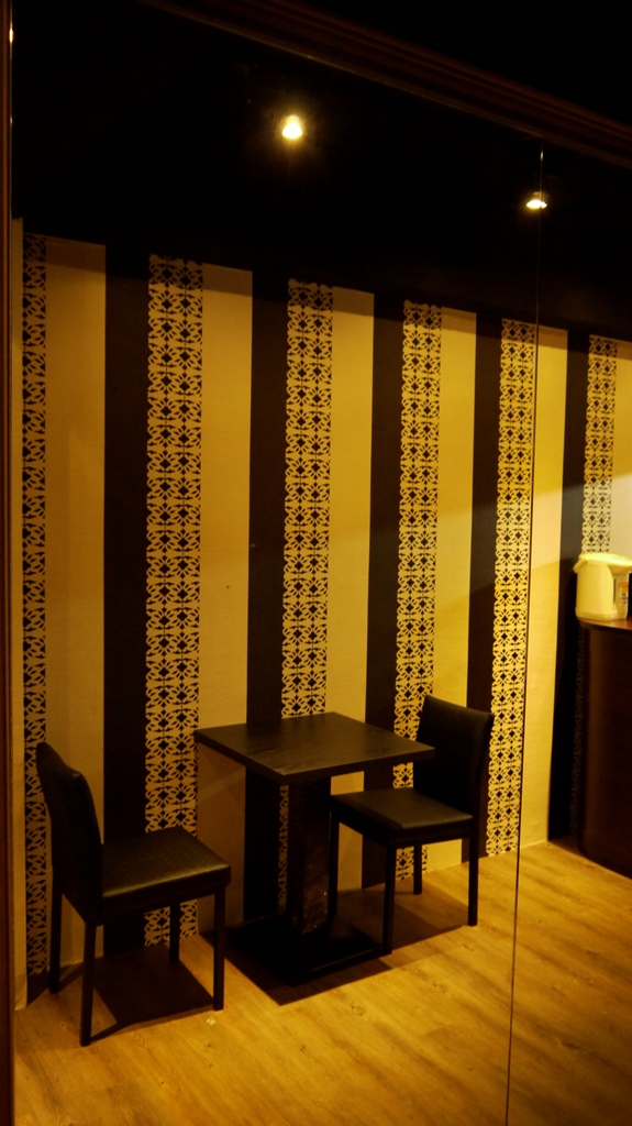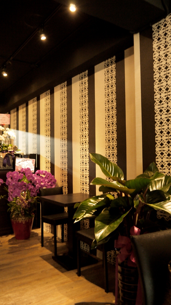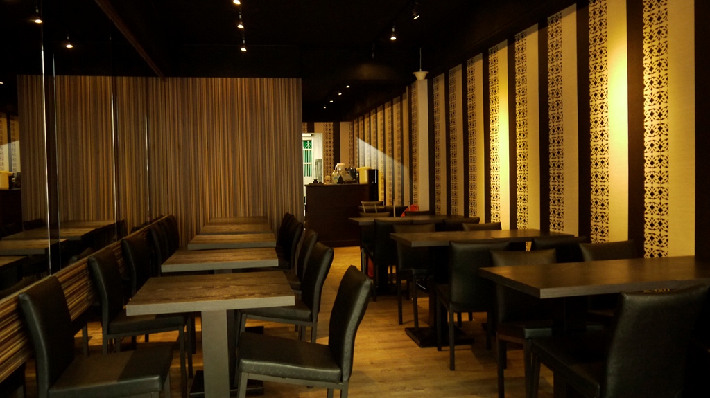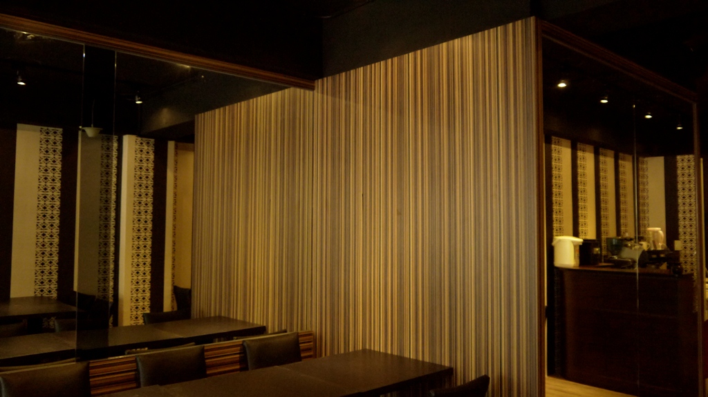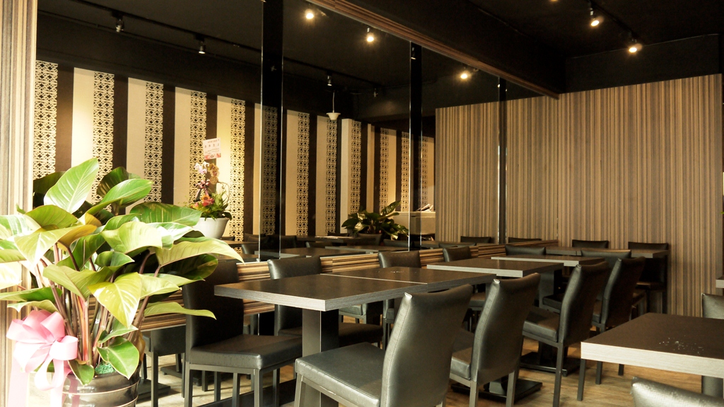 | 此案屬狹長型空間,故設計上採納大量鏡子使其橫向視覺達到放大效果,設計概念是以直線條元素構思,呈現整體空間架構與風格(如材質搭配上深淺咖啡色之直線美耐板、黑白色之直線花樣壁紙、明鏡灰鏡直線拼接等變化,搭配深咖啡色地坪及黑色有質感的餐桌椅),營造店內沉穩又當代的特色,使其別於一般素食餐廳給人意象,提供一個優質現代的素食空間。 |