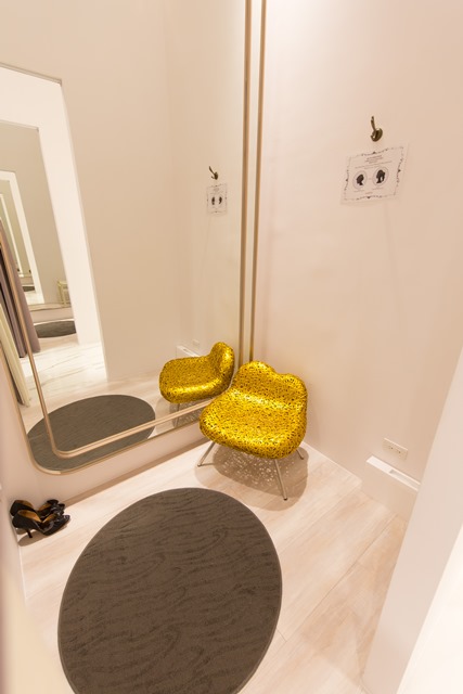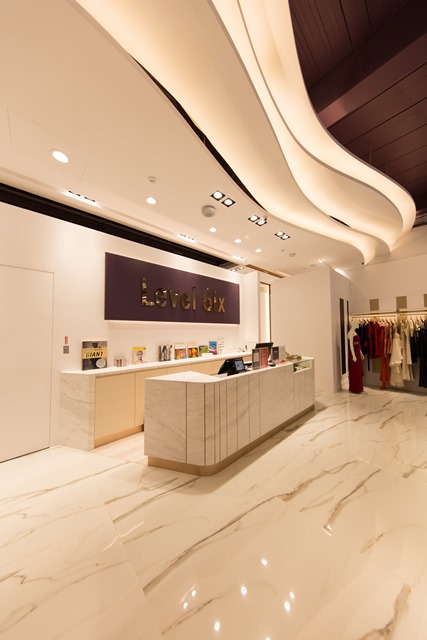 一開始波浪形的開放式天花設計,可將部分的展示商品慢慢引導著視覺與動線進入,對於一般以封閉式的商場來說,這是一個大膽的嘗試。從高端質感的銀狐石和酸蝕銅鏡,強調整體大方的空間調性,從開放而多元的環境條件中,注入一種潮流與高雅並行的品牌個性。