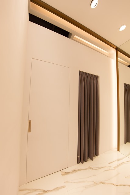 於桃園華泰名品城內,潮流選品店LEVEL 6ix設立新的據點,有著多元化的環境特質和現場條件,寶吉祥設計團隊持續為品牌置入鮮明的空間印象,長型格局的服飾店正對著設有開放空間的公共廊道,設計師選擇以接納的空間思維,刻意保持原結構高度將近5米不封閉,以自然且開放的天花造型帶出視覺縱深,詮釋一種有如織品流動韻律,並透過開放的形式操作以前後的弧型串聯,同時呼應了地上圓型量體的陳列道具,並利用同樣型體的展示鏡來折射創造出周圍的白/金色系展架,不同的折面也反映出不同的空間畫面。牆面的展示區,除了展示商品外,背牆的酸蝕銅鏡也隨不同的牆面起伏線條,配合燈光的折射,有如水波紋的閃爍,連串著後方試衣空間,營造出光線的層次分布和帶有神秘感的空間氛圍。